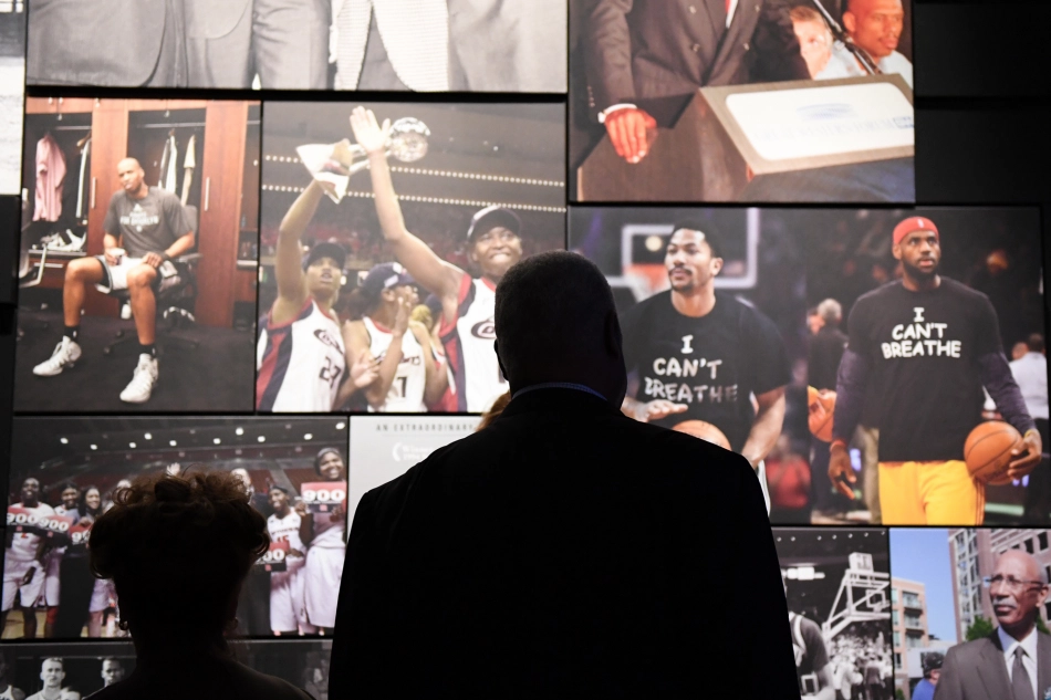 Robertson e la moglie giunsero finalmente all’area dedicata alla pallacanestro, dove a dominare la scena vi sono leggende come LeBron James, Derrick Rose – entrambi con magliette con lo slogan “I Can’t Breathe” – Kareem Abdul-Jabbar alle prese con tematiche sociali, Dave Bing – Hall of Famer nonché sindaco di Detroit – e le Houston Comets con il trofeo WNBA. Infine, proprio un’iconica foto di Robertson a mezz’aria.