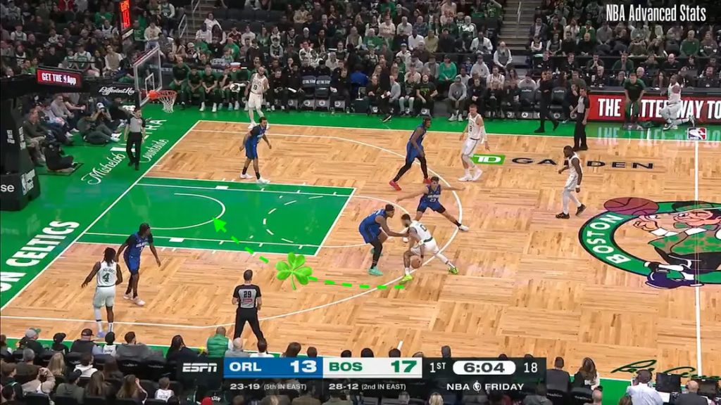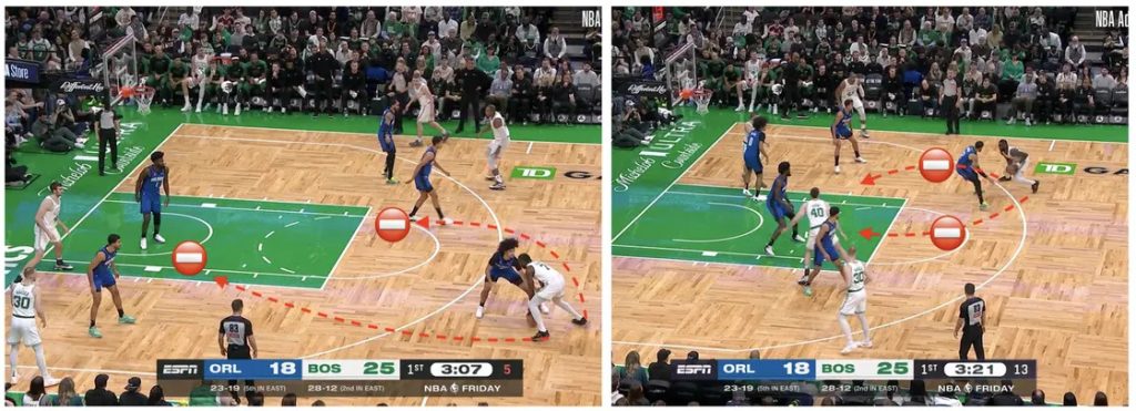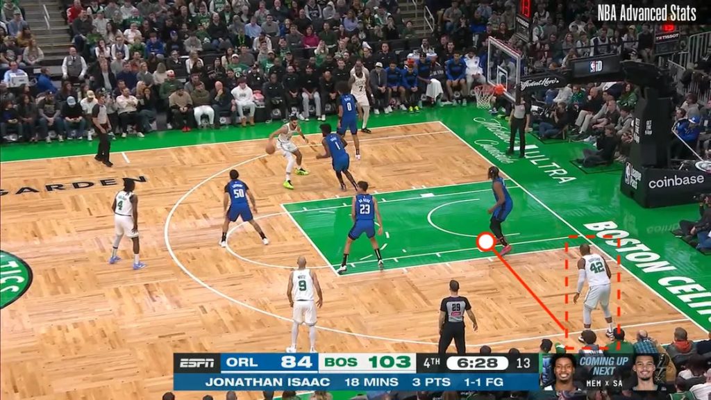 Porzingis allarga gli spazi poiché si posiziona ad un passo da una corsia offensiva libera, mentre Horford staziona spesso nell’angolo, come detto. Un tiratore nell’angolo apporta meno spazi liberi rispetto ad un Centro posizionato a 2 passi dal perimetro, in posizione di ala o vicino alla lunetta.