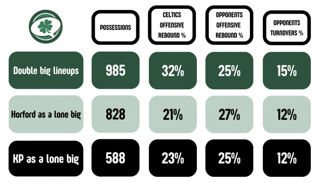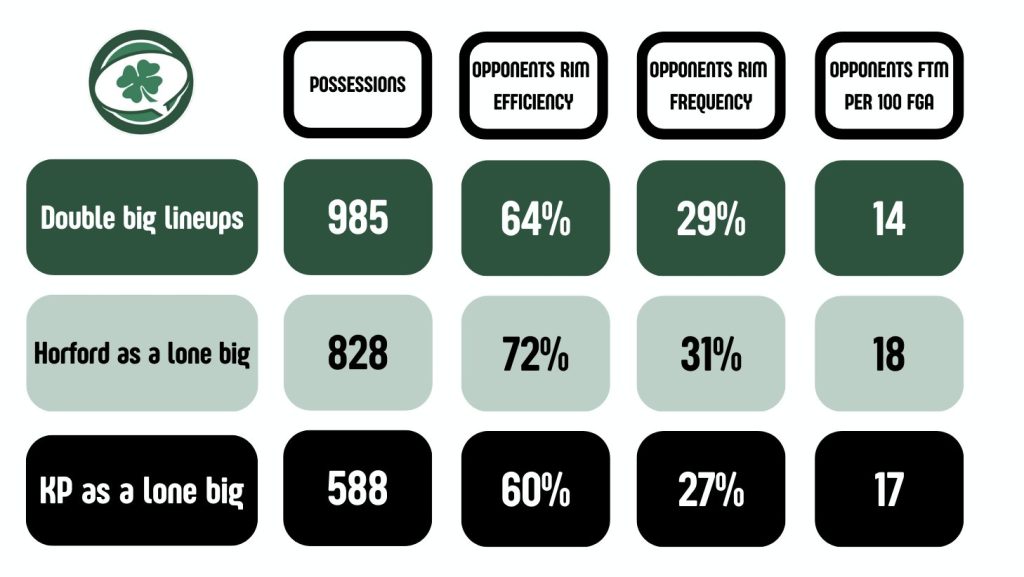 Con l’avanzare dell’età la fase difensiva di Al Horford, basata pesantemente sugli switch, sta diventando sempre meno efficace. Adesso dimostra più difficoltà che in passato difendendo su ali rapide. Ed anche se i Celtics lo utilizzano maggiormente in drop coverage, è carente dell’istinto e delle capacità di un centro elitario nel difendere nella stessa situazione, come KP. Affiancare Al ad un altro centro aiuta a controbilanciare le lacune. Difensivamente, i quintetti con il solo Porzingis superano di gran lunga gli altri schemi. Ma i quintetti Big si distinguono per alcuni vantaggi nel corso dei possessi.