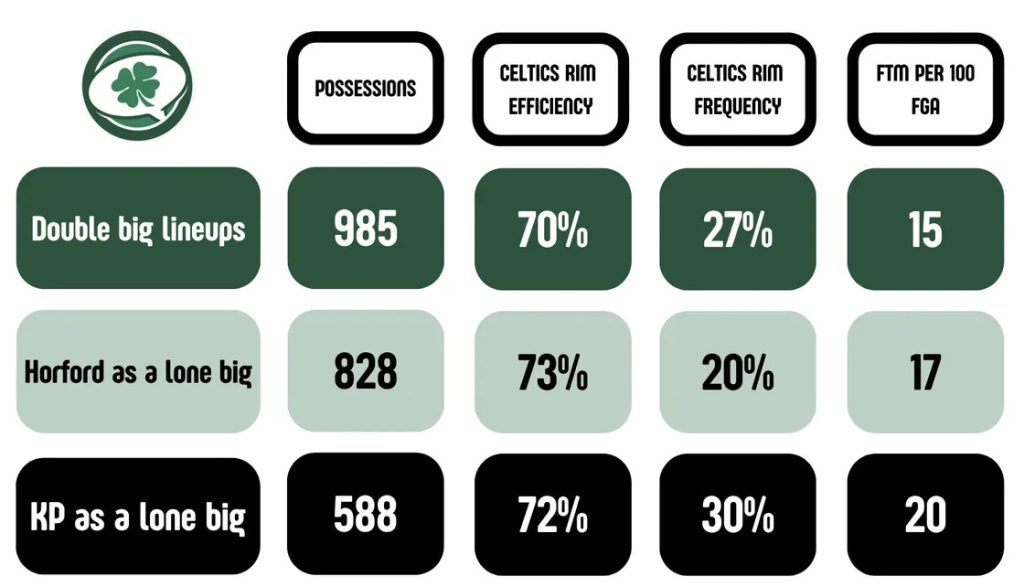 Le statistiche evidenziano immediatamente che le spaziature migliori dei Celtics siano messe in pratica con Porzingis unico centro. Con The Unicorn i bianco-verdi ottengono la loro massima frequenza attaccando il canestro, la loro miglior efficienza offensiva e maggior numero di falli ricevuti andando in lunetta. Di contro, quando Horford è l’unico Big Man i C’s non riescono ad imprimere molta pressione sul ferro rivale, con il solo 20% di conclusioni provenienti da meno di 1,2 m e soltanto 17 tiri liberi ottenuti su 100 tentativi dal campo. I quintetti con doppio centro dimostrano una peggior gestione degli spazi, se paragonati alle line-up con il solo Porzingis. Comunque, le statistiche messe a referto dai quintetti con doppio lungo sono simili a quelle dei quintetti con il solo Al Horford. Ciò può attribuirsi a 2 principali fattori: in primis, Horford è meno temuto al tiro rispetto a Porzingis; inoltre, l’abilità nello sfruttare gli spazi del lettone massimizza quelle di squadra rispetto ad Horford, che spesso staziona solitario nell’angolo.