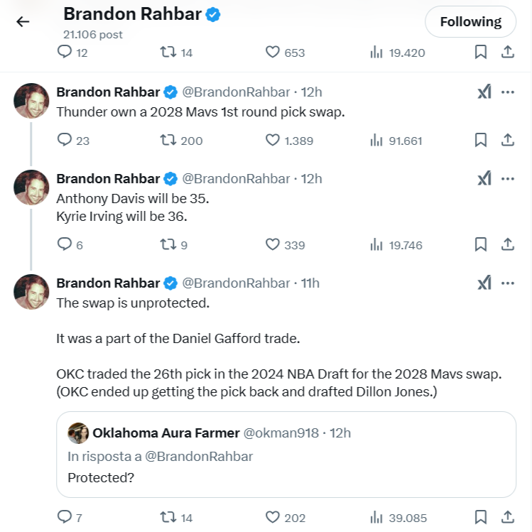 A parte il fatto che Dallas, adesso ridimensionata, è stata in queste recenti stagioni la vera e propria bestia nera di OKC, non solo eliminata da Luka&Co. al secondo turno dei passati Playoffs, ma anche uscita sconfitta in tre degli ultimi quattro incontri, il vantaggio per i Thunder è a lungo termine. Come fa notare Brandon Rahbar, beatwriter di Oklahoma City, Sam Presti – fra la pletora di first-round pick accumulata – ha collezionato anche il diritto “swap” (sostituzione) sulla first-round pick del 2028 dei Dallas Mavericks, senza protezioni. In quel momento, Anthony Davis e Kyrie Irving potrebbero essere rispettivamente 35enne e 36enne, dunque al di fuori del prime, oppure essersene anche andati dal Texas, dove il futuro adesso si fa molto incerto: