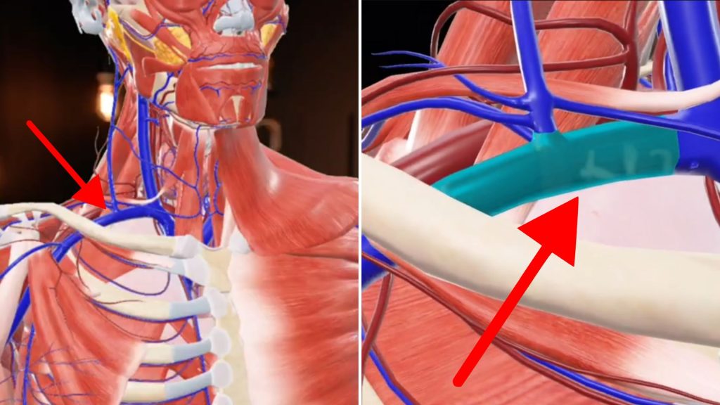 Il rapporto degli Spurs annuncia che a Victor Wembanyama è stata diagnosticata una trombosi venosa profonda alla spalla destra e che si prevede che salterà il resto della stagione, in attesa di aggiornamenti. Per capire come mai, dobbiamo partire dal nostro modello anatomico e capire dove si verifica esattamente questo coagulo di sangue. Nascondendo gli strati muscolari, vedremo i vasi sanguigni chiave che sono importanti qui nel collo. Voglio che vi concentriate in particolare su questo vaso sanguigno blu [immagine seguente, ndr]. Si tratta della vena succlavia, sotto la clavicola. Si tratta di una vena di grandi dimensioni che preleva il sangue dall’estremità, dal braccio, e lo rimanda verso l’alto, passando dalla vena cava superiore fino al cuore: da qui, il sangue viene pompato verso i polmoni seguendo l’intero iter della circolazione polmonare, fino al ritorno definitivo al braccio attraverso l’arteria succlavia. Classicamente, una TVP o una trombosi venosa profonda, questa malattia di Paget-Schroetter, si verifica quando si ha un coagulo di sangue nella vena succlavia o nella vena ascellare. Inizialmente si tratta della succlavia, poi prosegue nella vena ascellare, scendendo. Come nel caso di un coagulo di sangue nella gamba, questo si può embolizzare, cioè spostarsi e, se si sposta, la cosa più in prossimità è il cuore e infine può arrivare al polmone. Quindi può essere letale. Ma, con un trattamento medico tempestivo, non è mortale.