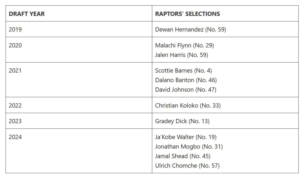 Ed anche se finora i Raptors non sono stati in grado di replicare quel periodo di fasti generati dalla crescita dei giocatori ottenuti dal Draft, almeno fino alla Rookie class 2024, si può dire che i dubbi avuti sulle mosse messe in atto nel post-Titolo NBA sono stati fin troppo esagerati. Tra i giocatori in quintetto, 8 su 12 sono stati second-rounders, di cui 6 scelti dopo la pick #45. Spesso i giocatori scelti a quel punto non riescono a proseguire la loro carriera in NBA. Delle 4 pick al First Round avute finora, l’unico vero rimpianto è rappresentato da Malachi Flynn, giunto al relativamente basso costo di una #29 scelta al Draft 2020.